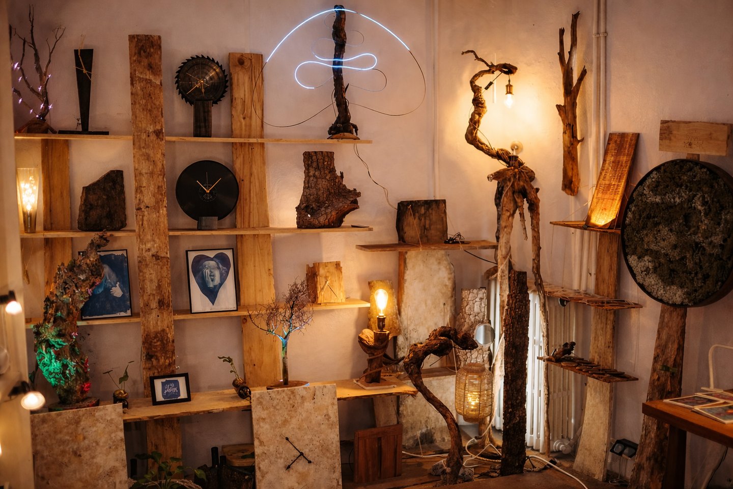 Luminaires réalisés à partir de matériaux naturels et objets recyclés.